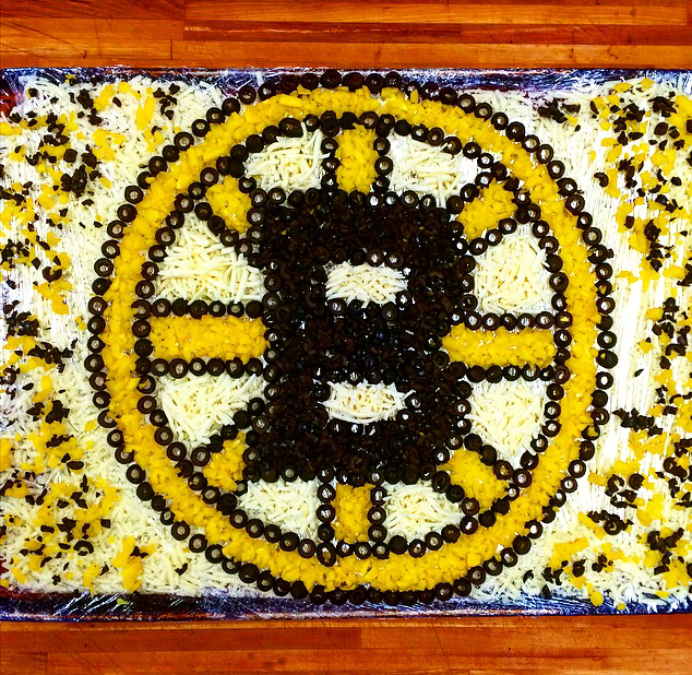 Are you a hockey fan? This pizza is for you! A full sheet pan (feeds 18-24 people) of yellow bell peppers, black olives, and mozzarella cheese. Call 401-621-9357 today to place your order ($49.99).