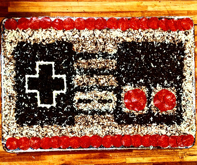 The perfect pizza for the gamer in your life! This full sheet pan (feeds 18-24 people) is made with mushrooms, olives, pepperoni, american and mozzarella cheeses. Call 401-621-9357 and order today ($49.99)