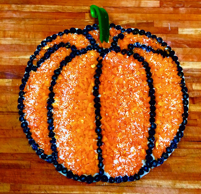 Perfect for harvest festivals and Halloween parties, this 16″ round gourd is made with orange bell peppers, black olives, mozzarella and romano cheeses and a green pepper stem. Call 401-621-9357 to order one today!