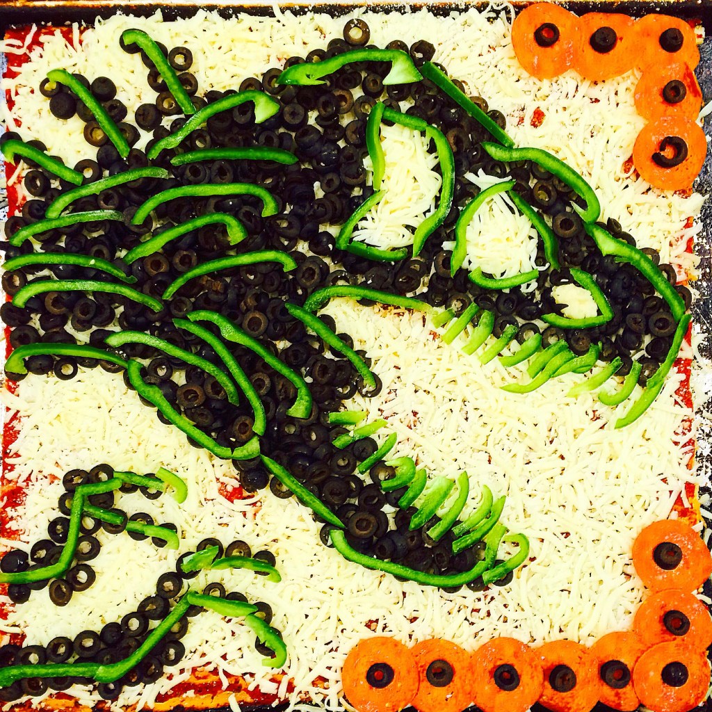 This pizza is perfect for the dinosaur lovers! It is a full sheet pan and feeds 18-24 people. This pizza is made with pepperoni, black olives, green peppers, and mozzarella cheese. Order by calling 401-621-9357. One day’s notice required for purchase ($49.99).