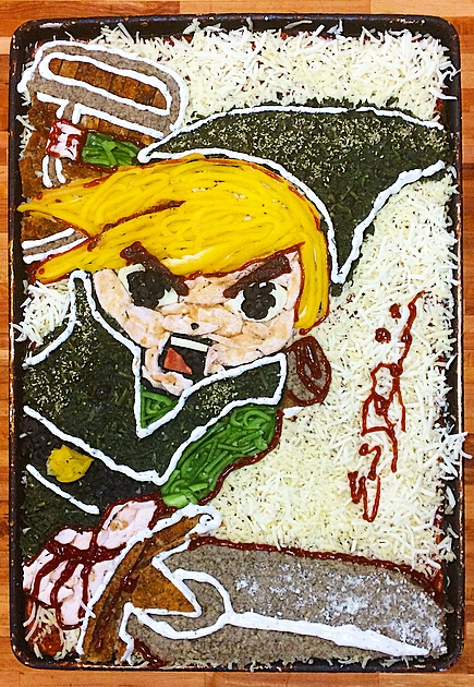 You can find the Triforce of Deliciousness with this pizza portraying Link in action!